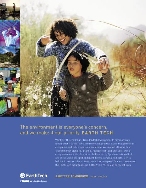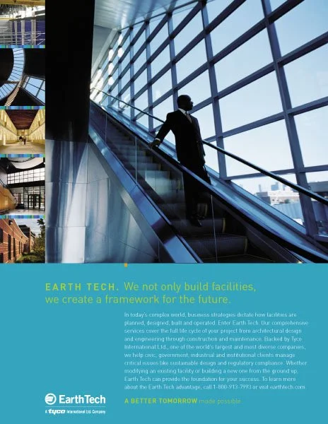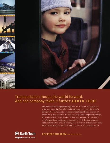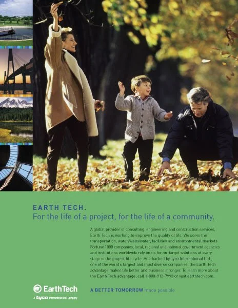 Capturing Earth Tech’s unique value proposition—the vision to improve quality of life and build a better tomorrow through the development of public and private infrastructure—began with the creation of a tagline. In collaboration with Baker Brand Communications, I developed brochures, print ads, and a corporate website using clear visuals and messaging to tell a cohesive story of how Earth Tech’s four divisions aligned around and reinforced this shared vision.