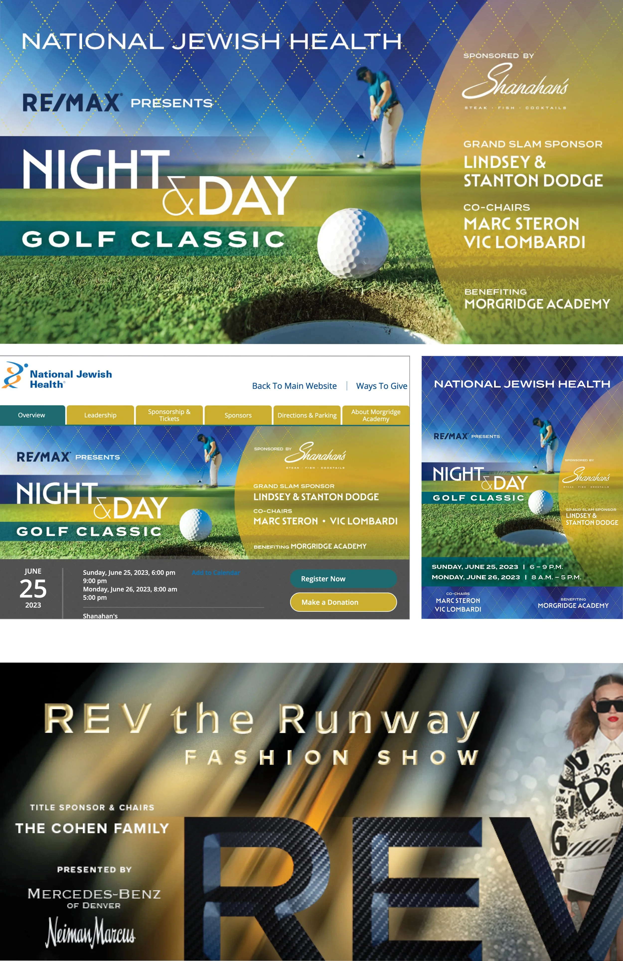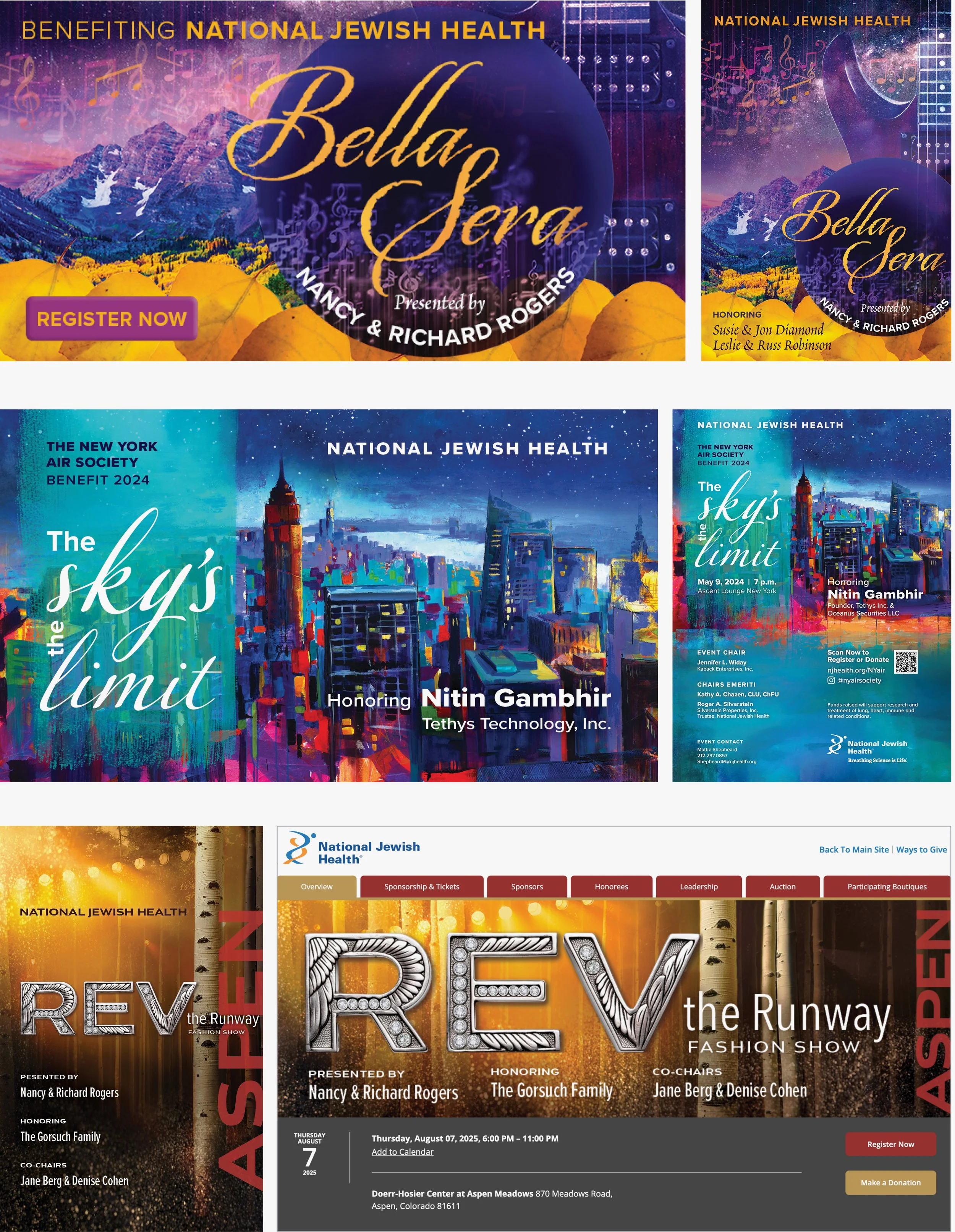 As a nonprofit organization, National Jewish Health hosts fundraising events nationwide, ranging from golf tournaments and themed gatherings to elegant evening galas. For each event, I design cohesive visual systems tailored to the audience and tone, spanning both print and digital platforms.