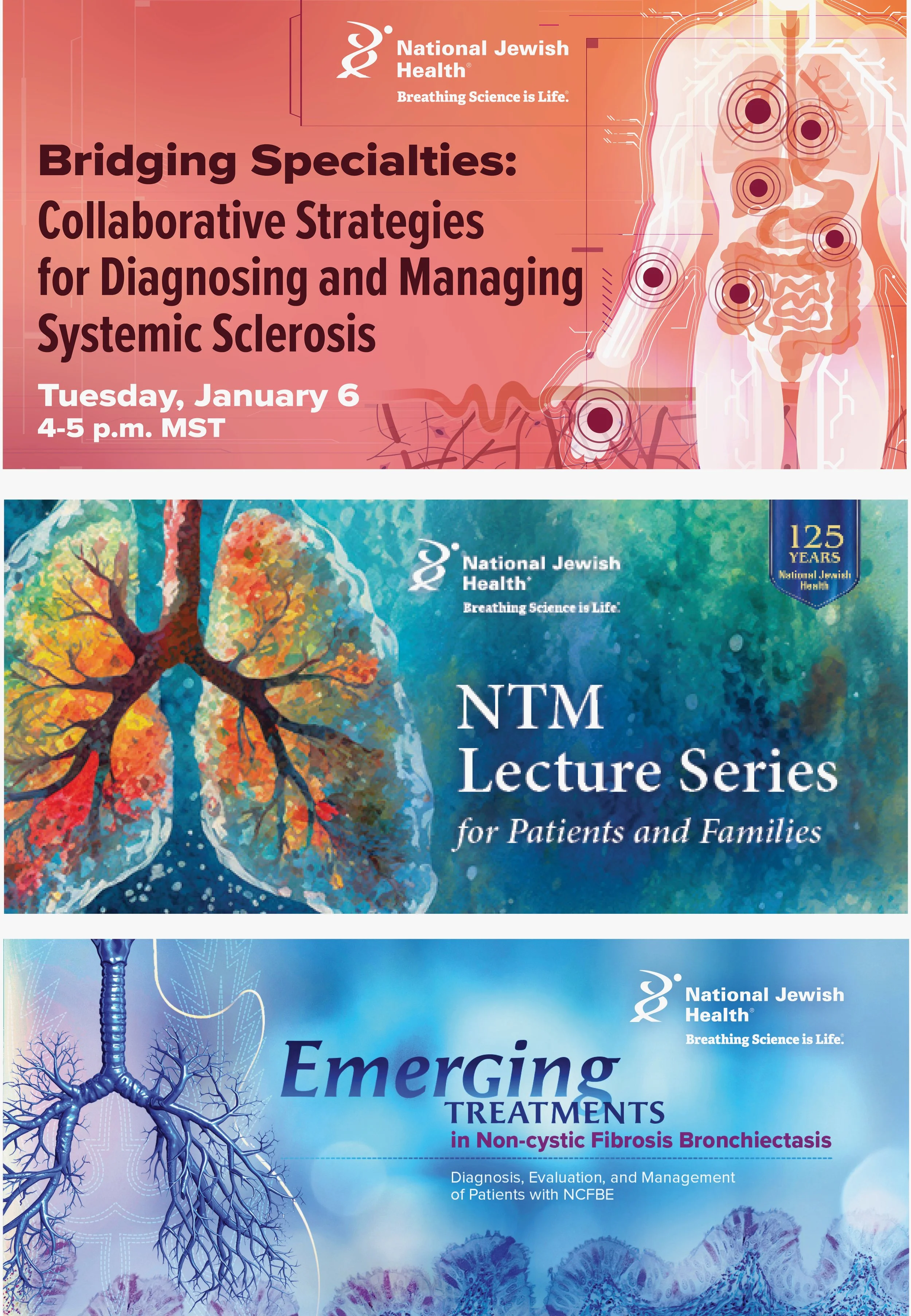 National Jewish Health is committed to advancing medical knowledge through educational content for researchers and healthcare providers, delivered via conferences and seminars nationwide. For these events, I created materials that distill complex clinical topics into compelling visual narratives. Each image serves as the hero graphic across multiple touchpoints, including PowerPoint presentations, digital banners, signage, programs, and supporting materials.