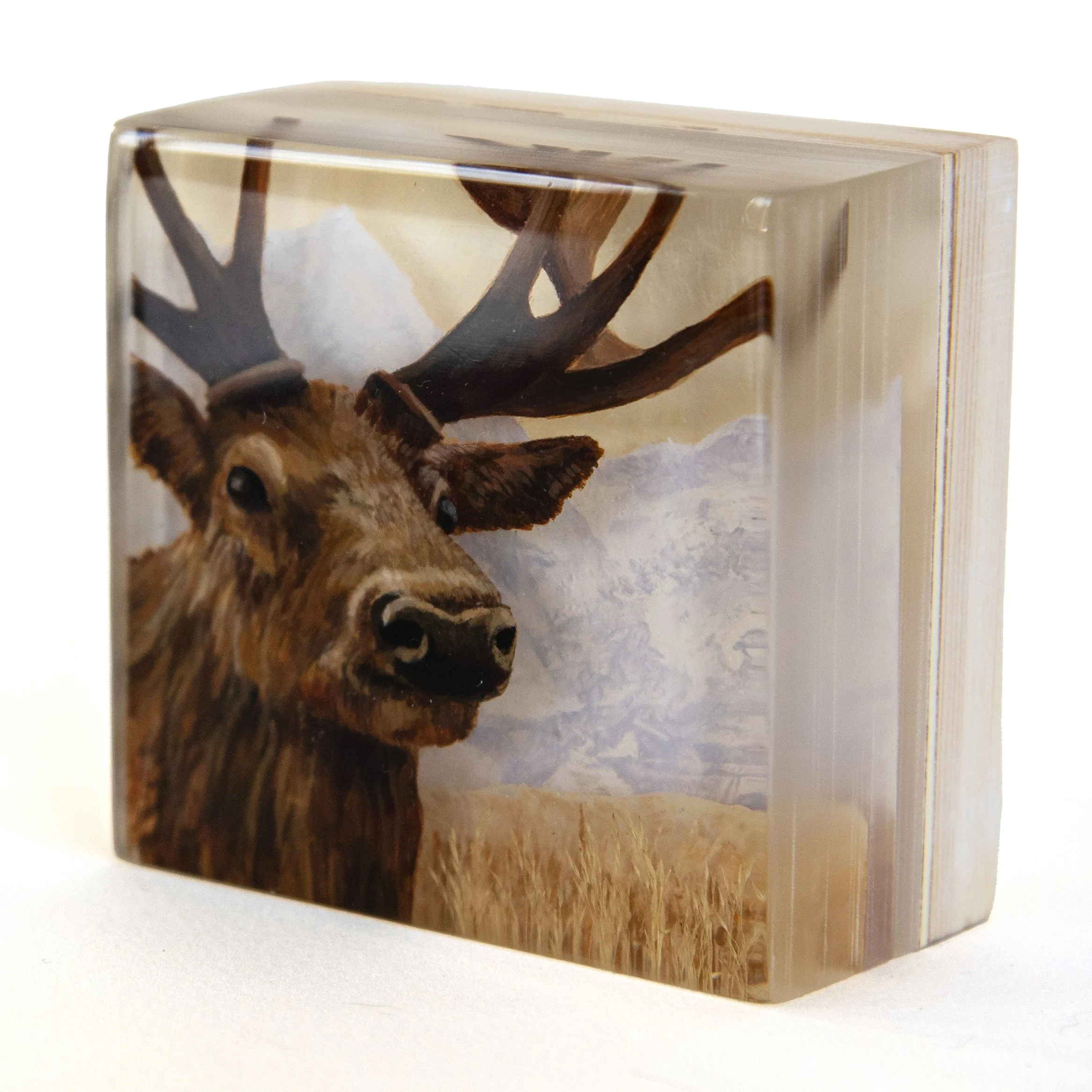 Elk EncounterPainted on numerous layers of resin with added nature bits to create an unexpected depth.4” x 4” x 1.75””