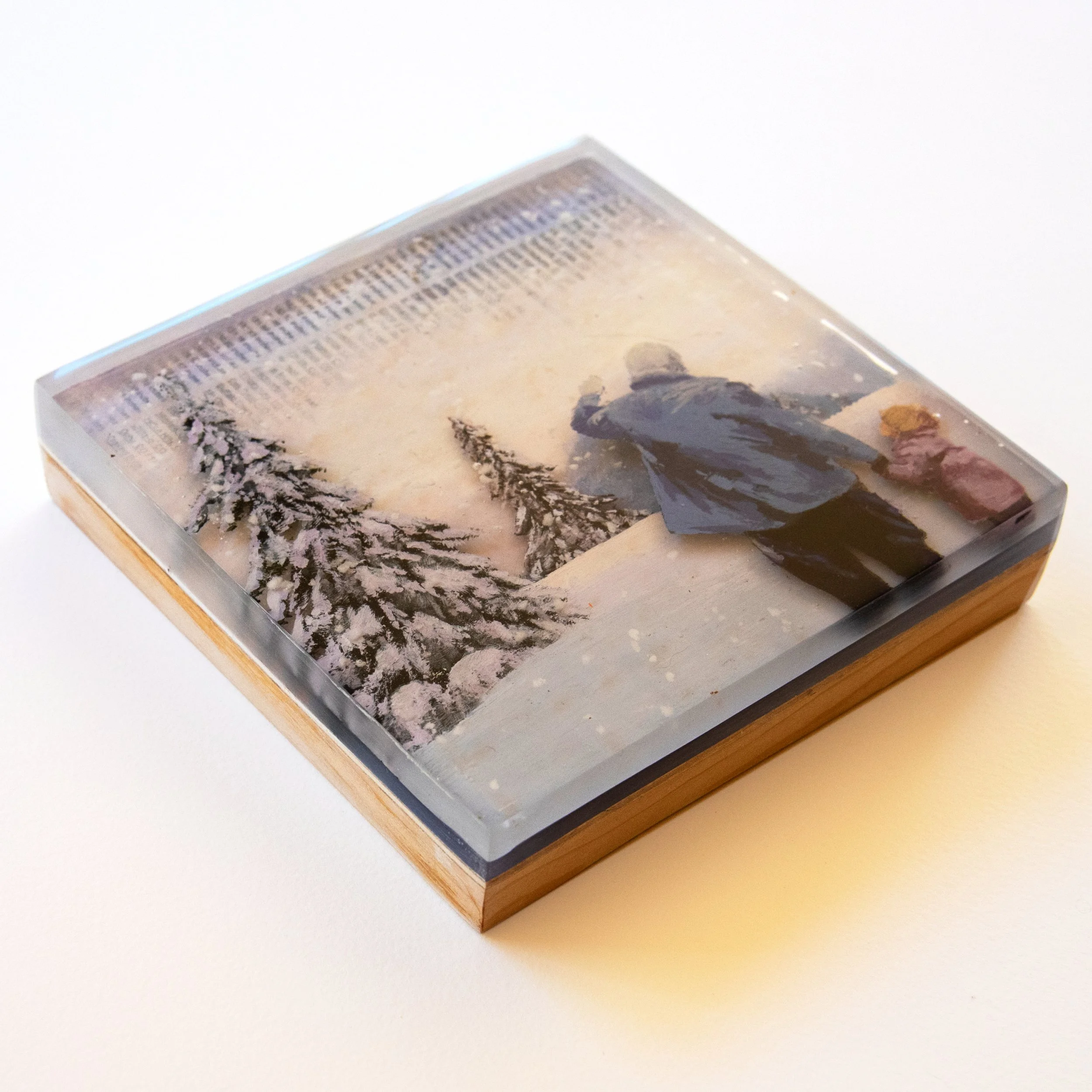 A tally of annual Colorado snowfall averages form the backdrop of a snowy mountain day. Falling “snowflakes” are embedded in multiple layers of paint and resin to create a moment captured in time.